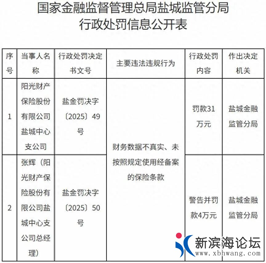 近日,国家金融监督管理总局盐城监管分局罚单显示,阳光财产保险股份有限公司(下简称“阳光财险”)盐城中心支公司因财务数据不真实、未按照规定使用经备案的保险条款等,遭罚款31万元;对总经理张辉警告并处罚款4万元。